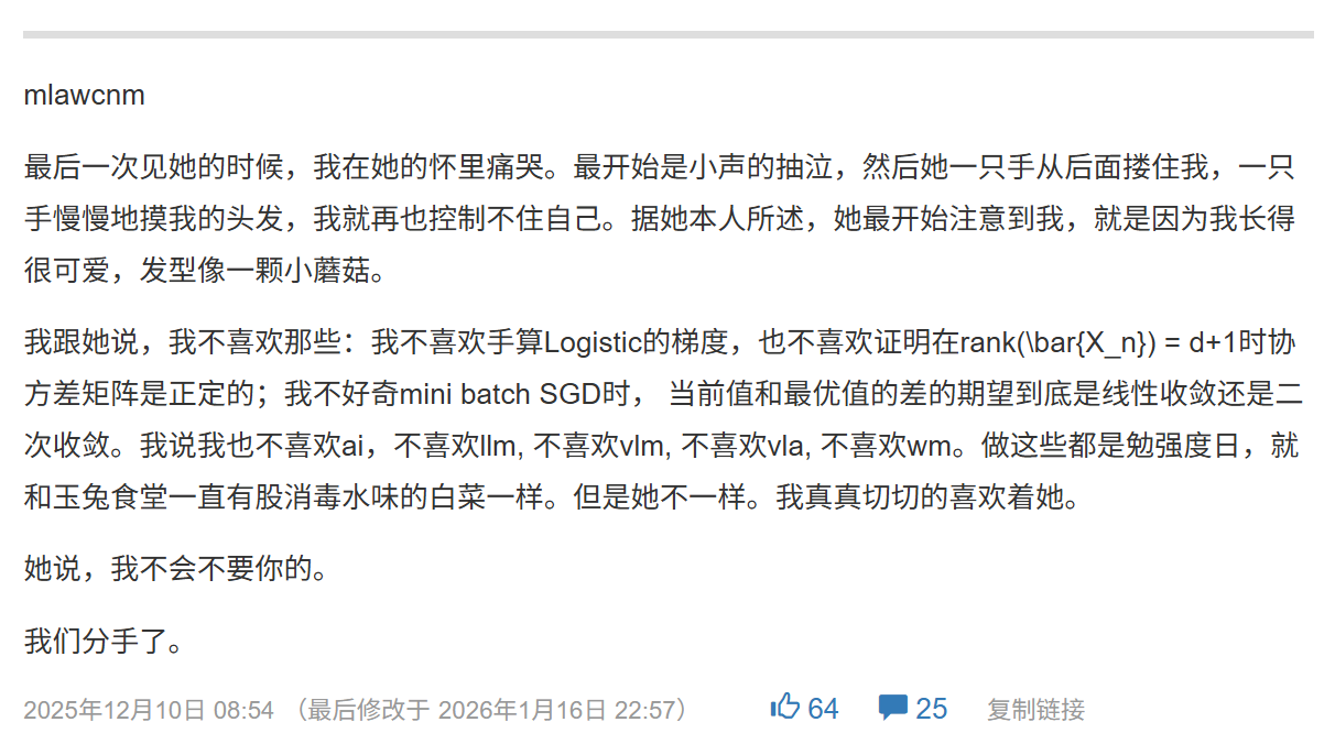 出处是匿名用户在这学期人工智能专业的一门难度极大的神人课程机器学习 A 的评课社区的一条评论, 因为内容实在过于艺术而且今天正好情人节所以顺手在这里转载一下, 如有侵权请联系删除.