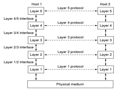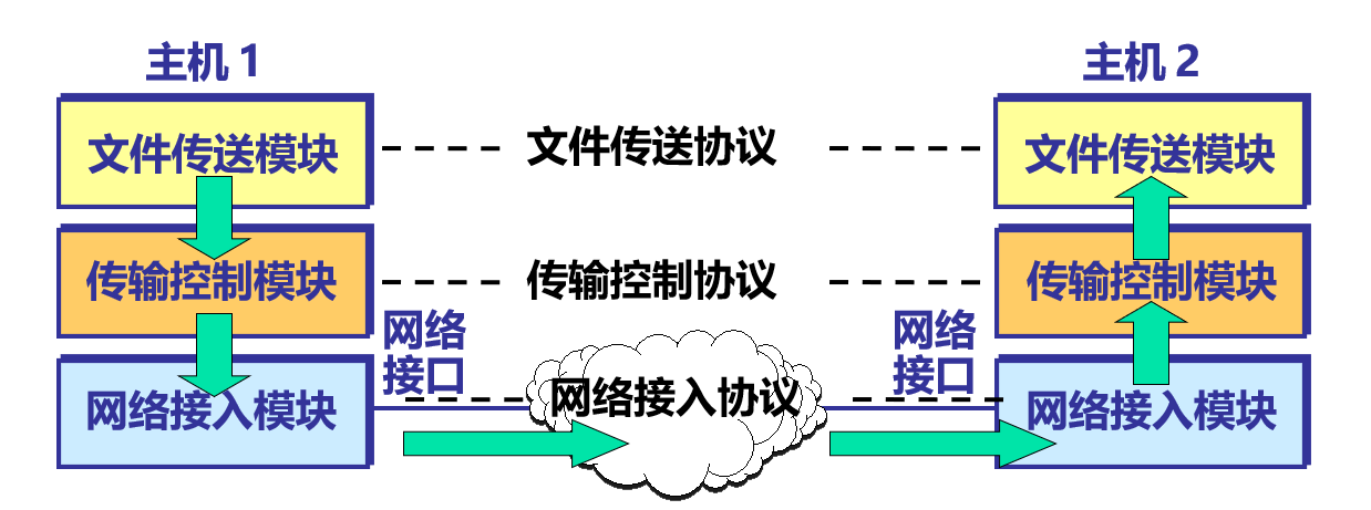 每一层都建立在下一层的基础之上, 为上一层提供服务. 对于每一层, 在网络体系结构中都可以定义相应的协议实现该层所需的服务.
