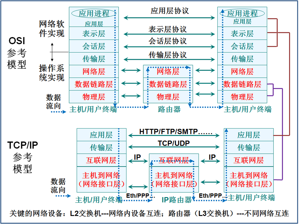 - OSI 模型中严格定义了服务, 接口, 协议, 但 TCP/IP 模型中没有严格区分服务, 接口与协议.