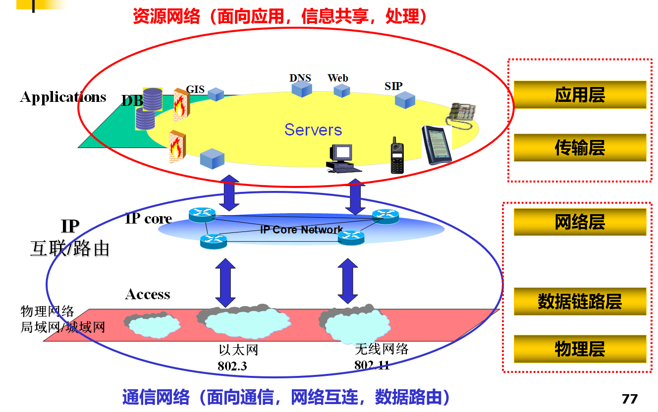 - 操作系统: 对节点上的资源进行管理, 为软件提供运行环境, 包括计算机操作系统和网络操作系统 (Cisco, VRP)