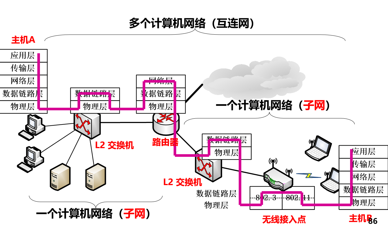 - 功能上: 提供数据传输功能, 确保计算机之间能交换数据