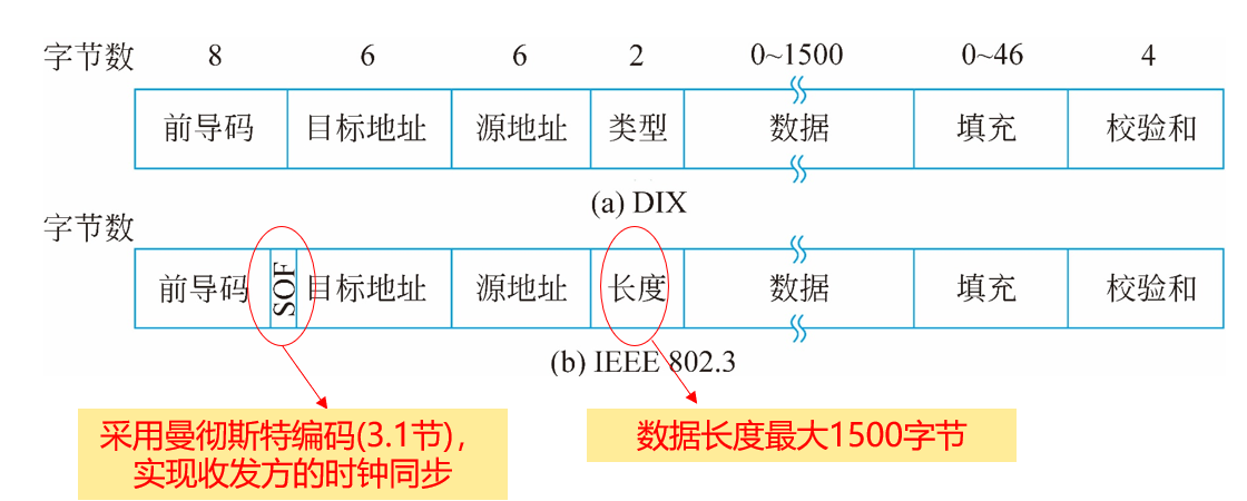 - 成帧: 在接收方从比特流中恢复出帧, 关键在于确定帧开始和结束的地方, 即帧定界
