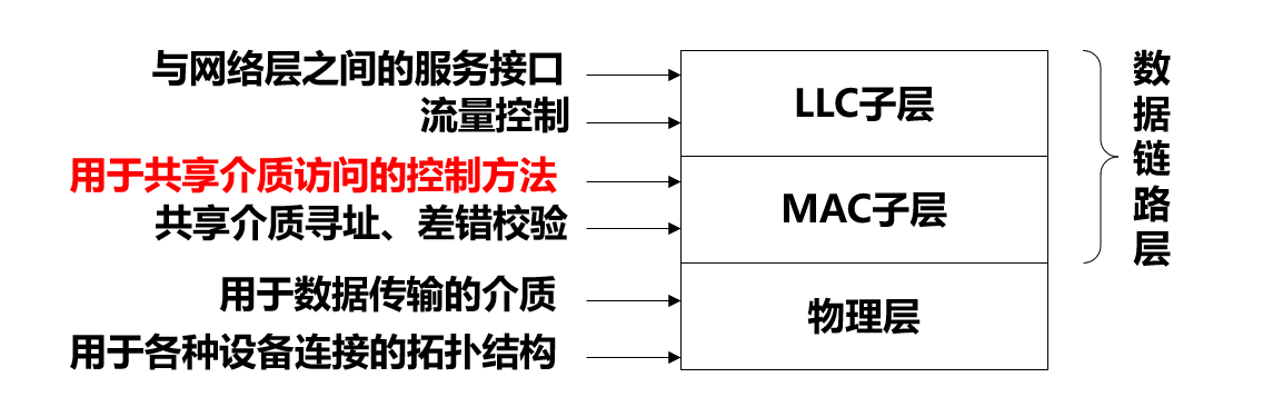 - 在传统链路控制 (如点对点通信的串行链路) 中, 没有管理访问共享 (广播式) 介质的逻辑需求 , MAC 子层负责对共享介质的访问进行控制
