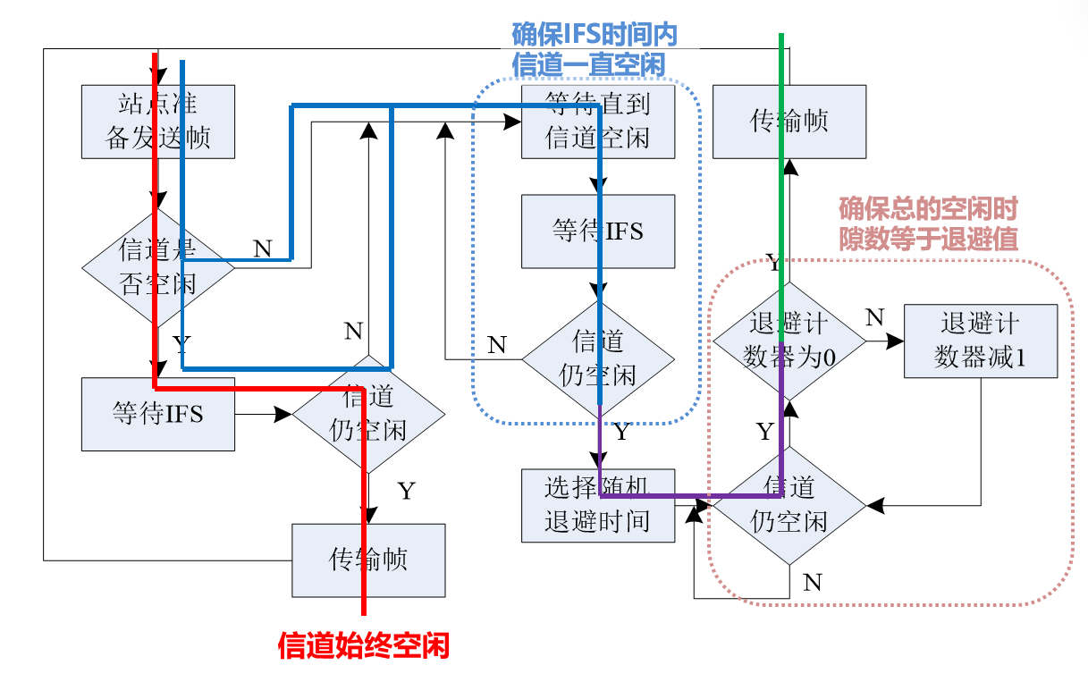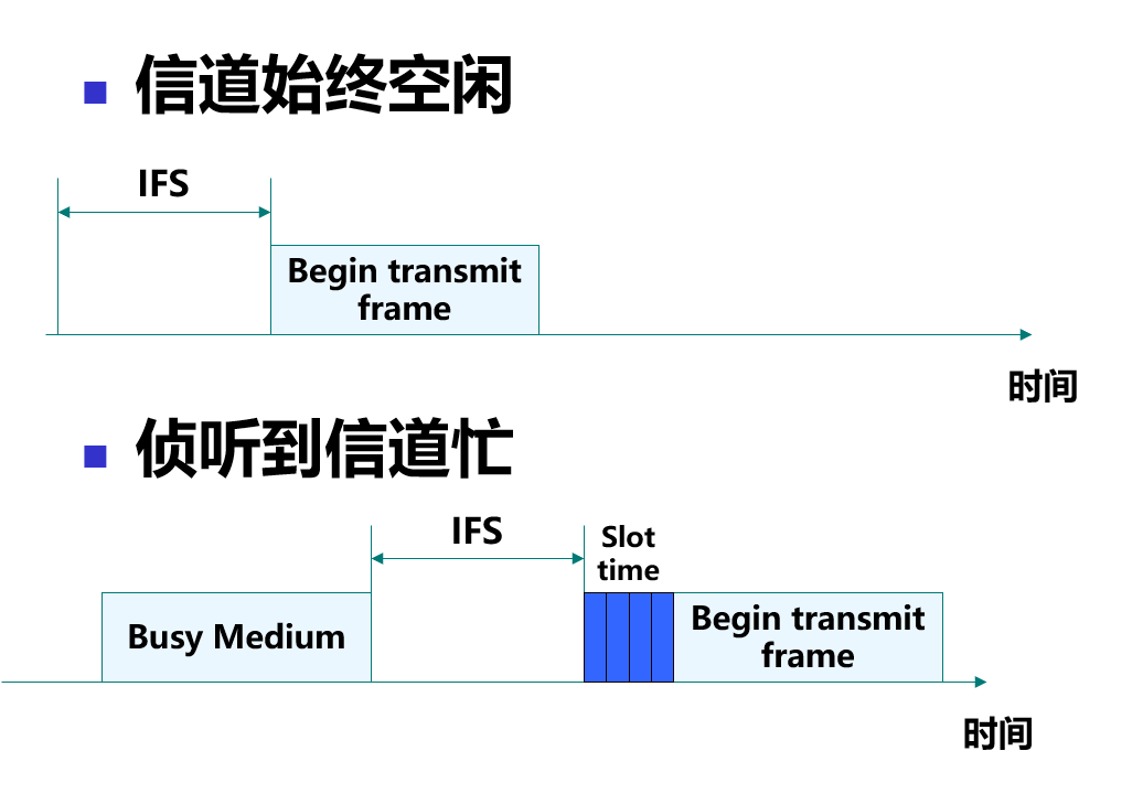 - 载波侦听: 发送帧之前侦听无线信道是否空闲, 若是则进入冲突避免阶段, 若否则延迟直到信道空闲