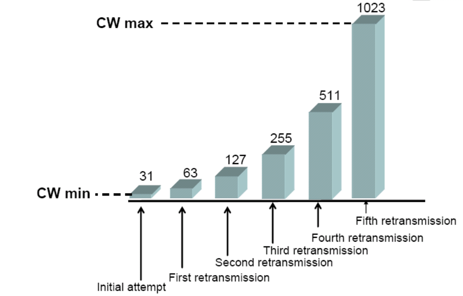 - CW 从开始, 每次重传都将 CW 加倍, 直到到达.