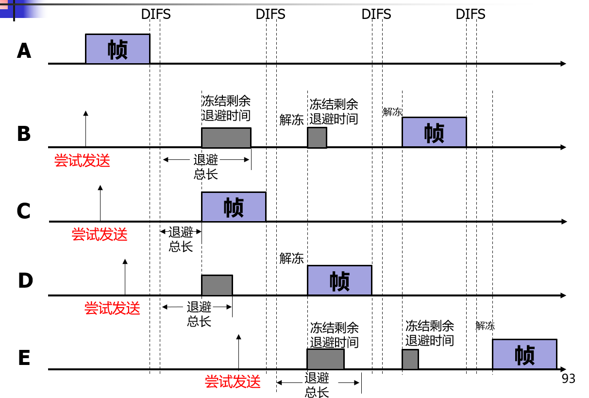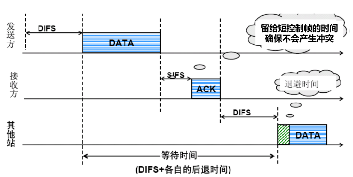 - ACK 帧不需要执行随机退避算法, 而是直接等待一个 SIFS 时间后就发送 .