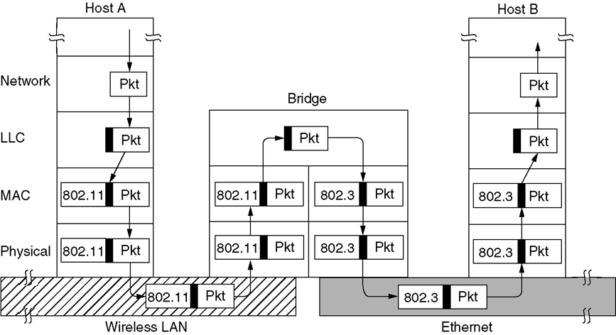 - 不同帧的格式转换: 由于帧格式的不同, 需要重新组帧, 某些域需要丢弃或产生还需要重新生成检验和.
