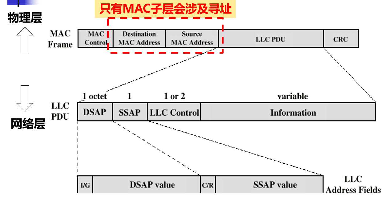 注意, 对于很多数据链路层协议 (如以太网) 使用无确认无连接服务, IP 分组直接封装到 MAC 帧中, 没有 LLC 子层.