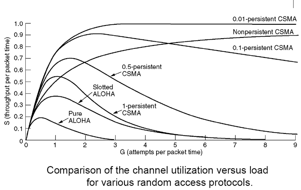 - 随机访问 (争用 contention): 只要有数据就可以发送, 发生冲突后再采取措施解决冲突, 适用于负载轻的网络, 负载重时效率低, 如ALOHA, CSMA.